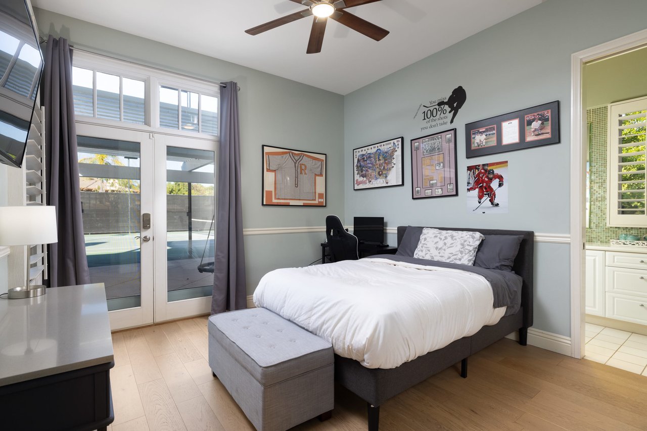 This expansive single-story ranch-style home masterfully combines elegance and comfort with refined touches throughout. This estate boasts exquisite features and expansive outdoor amenities. Upon entering, you're welcomed by a formal dining and living room featuring a grand fireplace. The family room is a focal point, complete with built-in shelves and a seamless flow into the gourmet kitchen adorned with quartz countertops and equipped with modern stainless appliances. The kitchen also features a delightful breakfast nook, perfect for casual dining with views of the picturesque backyard. Large stacking sliding doors throughout the home open effortlessly to reveal an expansive outdoor oasis. Step into the backyard retreat where a sparkling pool and spa await alongside the oversized covered patio. The property also offers a large lawn, walking path, tennis/sport court and a walled bocce area for ample recreational options. Conveniently nearby is a pool bath and a well-appointed wet bar ideal for entertaining guests. This estate offers four bedrooms including a luxurious primary suite. The primary suite features a fireplace, a separate sitting area or office with custom cabinetry and an ensuite bathroom designed for relaxation. Pamper yourself in the large soaking tub, large walk-in shower or enjoy the convenience of dual sinks and an elegant vanity. Additionally, the home includes a dedicated office space off of the entry and a versatile bonus room. Convenient parking is provided by a finished four-car garage and driveway. Set in the peaceful and spacious environment of Orange Park Acres, this home is a perfect blend of luxury and practicality. The home benefits from 38 owned solar panels. Nestled in the heart of Orange County, Orange Park Acres offers a serene equestrian lifestyle with spacious properties and scenic trails. Conveniently located near major freeways, residents enjoy easy access to city amenities while savoring the tranquility of a rural atmosphere.